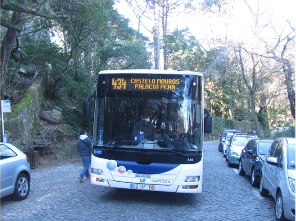 Dar bir yolda ve sürekli virajlarla dağa tırmanmaya başladık. Bizim doğu Karadeniz’i andıran bir yeşillik vardı. Şehir içini görme imkanımız oldu. Bu dik yokuşları ve arabaların zor sığdığı yolda tekerlekli sandalye ile gezmek imkansız. Gezi otobüsü her durakta aldığı yolcularla dolulukta bizim otobüslere rakip oldu. Hani belki ineriz de sarayı görebiliriz dediğimiz pena durağına geldiğimizde uzun bir kuyrukla karşılaştık.(Otobüsten çektiğim resimler)