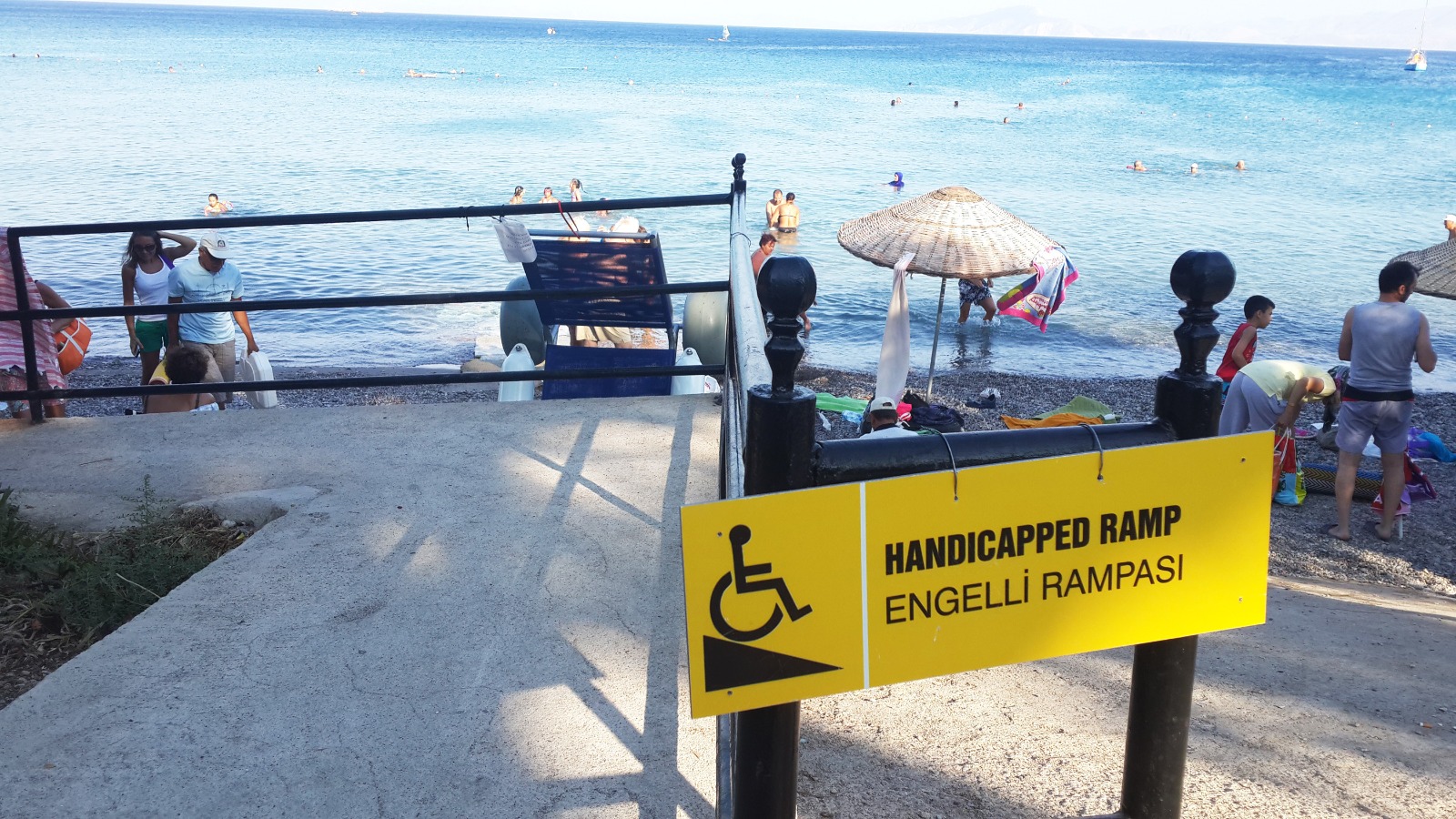 Olumsuzluklara gelince maalesef Datça’da engelliye uygun otel bulmak çok zor. Zira oteller genellikle butik tarzında ve bunlarda da engelli odası anlayışı ve bilinci yok. Ama bu durum sadece buraya özgü değil ,tüm ülke genelinde olan bir durum.Ben uygun tam olmasa da engelli oteli Mesudiye de bulabildim. Datça’ya 14 km. Yolları bol virajlı olduğundan Datça’ya gidip- gelmek epey yorucu oldu. Burada denize girmek için iki koy var. Hayıt bükü ve Ova bükü.Gelmeden önce yaptığım araştırmalar doğrultusunda, engelli için rampa bulunan Hayıt bükü plajını tercih ettik. Ama bu durum bir gün sürdü. İkinci gün rampa (dalga nedeniyle sanırım) darmadağın olmuş, rampanın yarısı denizin içinde durmaktaydı. Orada bulunan levhadan aradığım Muğla belediyedeki yetkili, “haftada bir gün geldiklerini, zaten Eylül 15 tarihi itibariyle bu rampaların kaldırılacağını” söyledi. Bir hizmet veriyorsunuz güzel, ama bu hizmeti tam verin. Bir hafta beklememiz mümkün değil. Tamam haftada bir normal denetimi yapın ama böyle durumlarda acil müdahale yapılması şart. Ben bu rampaya güvenip,uzun yollardan geleyim, ama geldiğimde kullanılmaz halde bulayım. İkaz ettiğimde de ise böyle bir yanıtı alayım. Kusura bakmasınlar ama bu kabul edilebilir bir durum değil. Bu arada engellilerin maddi durumları nedeniyle genelde sezon sonlarını tercih ettikleri göz önünde bulundurularak, hizmet bitim tarihini Eylül ayı sonuna kadar uzatılmesi yerinde olacaktır. (Bu sorunları belirten yazımızı Muğla Belediyesine gönderdim, hemen döndüler. Benden gerekli bilgileri aldılar. Düzeltme yolunda çalışacaklarını söylediler. Böyle bir ilgi beklemiyordum, Gerçekten olumlu bir davranış sergilediler. Teşekkür ederim)
